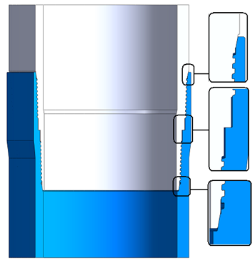 TP-ISF是我公司設計的整體半直連型特殊扣產品,其雙密封面設計,能保證接頭在內壓和外壓載荷下優異的氣密封能力, 中部扭矩臺肩對頂,可以控制擰接定位,方便油田現場的使用;雙極勾型螺紋連接,能保證接頭連接效率達到管體屈服強度的70~80%。 ![]() |